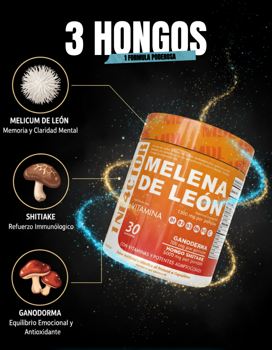 Polvo de frutos amarillos (mango, maracuyá, piña), Betaglucanos de Ganoderma Lucidum, Hongo Shitake, Hongo Deshidratado de Melena de León (Hericium Erinaceus), vitamina C, Vitamina B3, Vitamina B2, Vitamina B6, Vitamina B12.